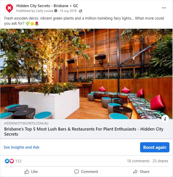 - For an article I wrote (in 2019), ‘Brisbane’s Top 5 Most Lush Bars & Restaurants For Plant Enthusiasts’, on Facebook I received 133 reacts, 18 comments and 25 shares.